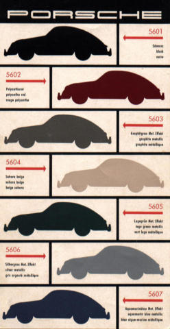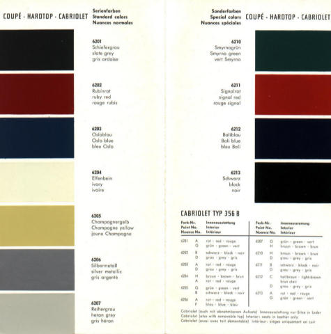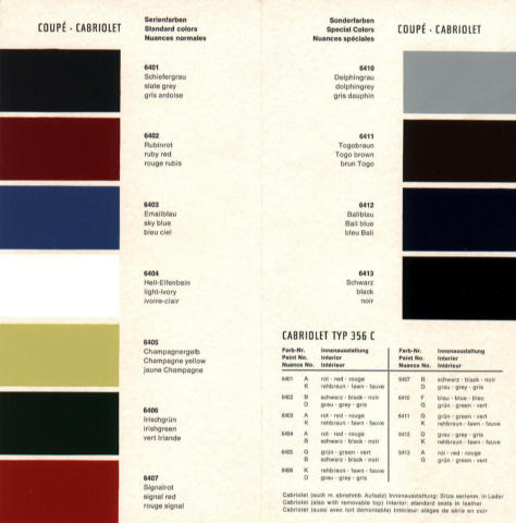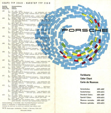 The purpose of this website is to set down in one place as much information as can be found concerning paint colors for 356 Porsches for the years 1950-1965. Paint matching today is one of the most vexing problems associated with restoring a 356 Porsche. Below you will find images of the factory color charts, a listing of paint colors with color numbers and door plate numbers, and much more. The following 356 Porsche factory color charts in order of presentation are for the: 356-A, 356-B T-5, 356-B T-6, and 356-C. unfortunately, color charts do not reproduce very well in a scanner, so........don't depend on these images for accurate colors. Another factor, these color charts are as much as 43 years old! There is some useful information on these color charts, including 356 Porsche color numbers, and information about paint and interior combinations.