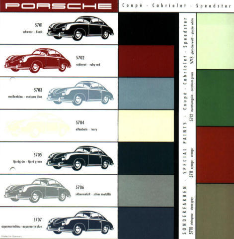 A listing of paint colors by Porsche in early 1957 listed the above seven standard colors, and four new colors referred to as SONDERFARBEN, "Special-Paints". The above 1956 paint numbers were re-numbered 5701, 5702, 5703, etc. The following special paints were available for all models at a slightly higher price.