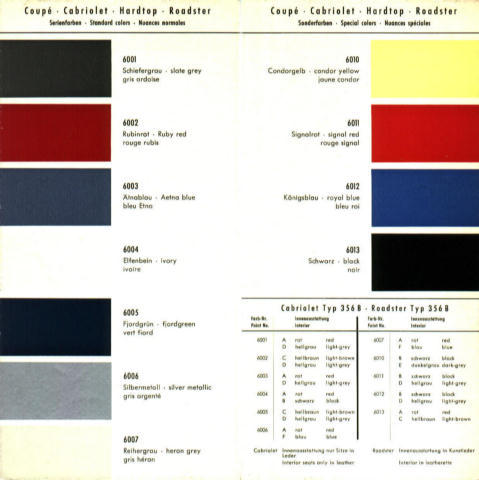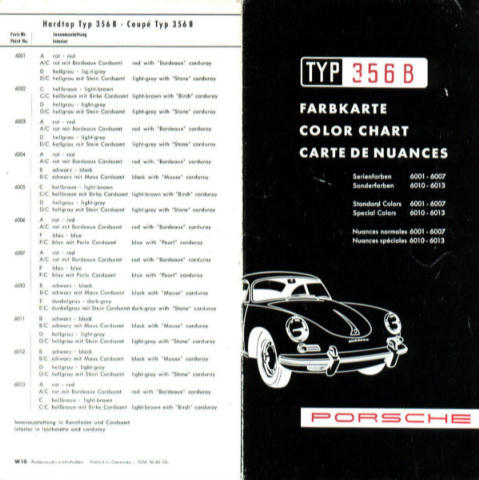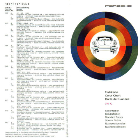 The above table shows the REGULARLY OFFERED factory interior color codes for 356 B's and 356-C's 1960 to 1965. This is NOT to say that there weren't other interior colors available as SPECIAL ORDERS, throughout the B/C production period. Most know that if you had the GELD, you could probably get any color you wanted!
